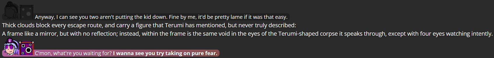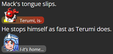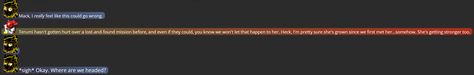 A big goal of this story was to elaborate on Terumi’s backstory, and give her some closure regarding her past conflict with Mitsumo. “Mack in Town” ended with Terumi in a position where they weren’t actively being pressured to fight during hostile encounters, but wasn’t a hindrance when they did so anyway; I don’t know how much that’s actually changed, but I think I wanted to at least slightly lessen the fear between Mack and Yuugen-V that Terumi couldn’t be a little bit more self-reliant, and I figured having Terumi face the monster who made her who she is today would be a perfect fit. I also just figured that with both Terumi and Mitsumo having been known for a while in the setting as separate individuals (unlike in Len’en, where Terumi is still under Mitusmo’s control and likely will be for the rest of the series), it would be worth it to finally see how the two faced each other in a conflict going beyond the status quo of the Len’en games.