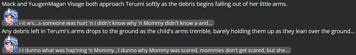 - Terumi: A character from the Len’en Project series who was possessed by Mitsumo for several years (not aging while under Mitsumo’s control), until she “died”; due to Mitsumo’s control over Terumi stemming from perpetually showing her worst fears, Terumi became a ghost; she was then found by Mack and Yuugen-V in 2022, and the three quickly developed a sibling-like bond, the three living together since then (though she has never clearly told them about what Mitsumo did to her). While Terumi was six years old when possessed by Mitsumo, and was still a six-year old (not counting when her aging was stopped) when meeting Mack and Yuugen, the start of this story indicates that Terumi is now eight years old (again, not counting her past halted aging). While Terumi was assigned female at birth and kept this identity in her first Chaos Zone appearance, she came out as non-binary between then and now, and likes being referred to with she/her pronouns or they/them pronouns interchangeably.