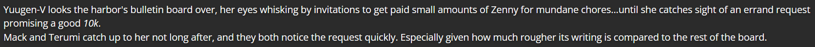 The idea of Mack, YuugenMagan Visage, and Terumi (collectively earning the name “M/Y/T”) living off of various small quests and missions on a bulletin board was something inspired by Fantasy RPG video games, which often have similar quests with rewards (albeit often in a “guild” of some sort).