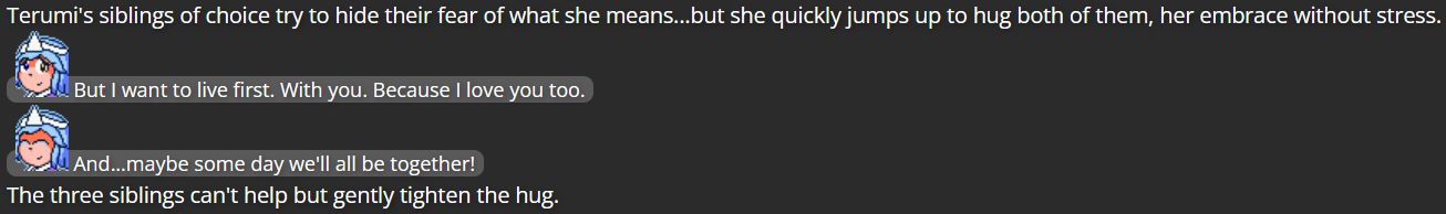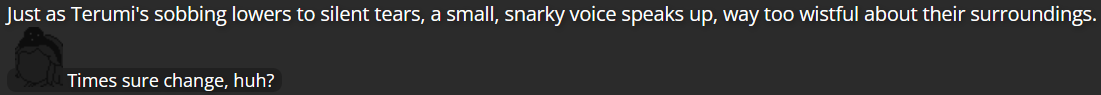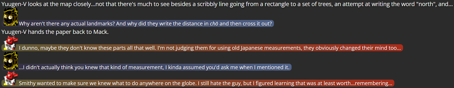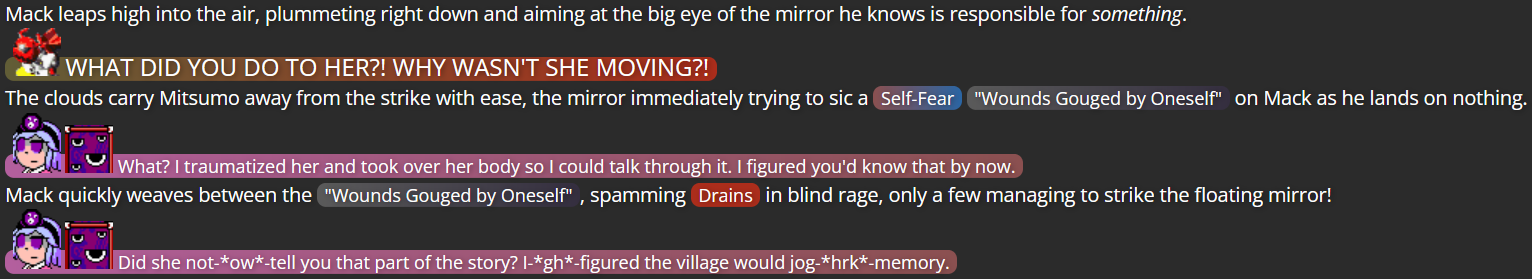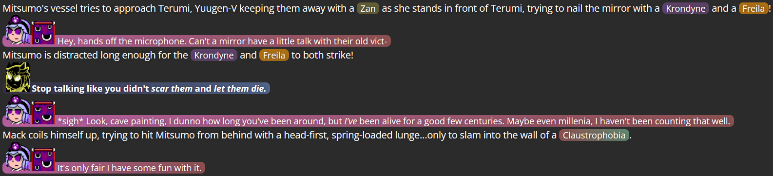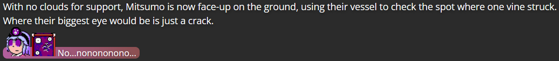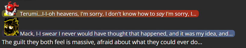 The extent of Mitsumo’s defeat was actually a pretty heavy decision; I rarely feel confidant about killing off characters, even villains, due in part to the sheer amount of characters from other media who I can’t use as villains of my own due to other writers using those characters (on top of the fact that these are characters who have, in a sense, been under my care, which makes me afraid to make such an intense decision for non-villain characters). However, I realized the writing wouldn’t be very satisfying if Mitsumo simply escaped after Terumi finally fought back against them, and so I made sure Mitsumo was defeated enough that, at least in terms of the narrative, Mitsumo was damaged enough that they couldn’t hurt anybody anymore (and if I ever did decide to bring them back, it would take the assistance of some other villain).
