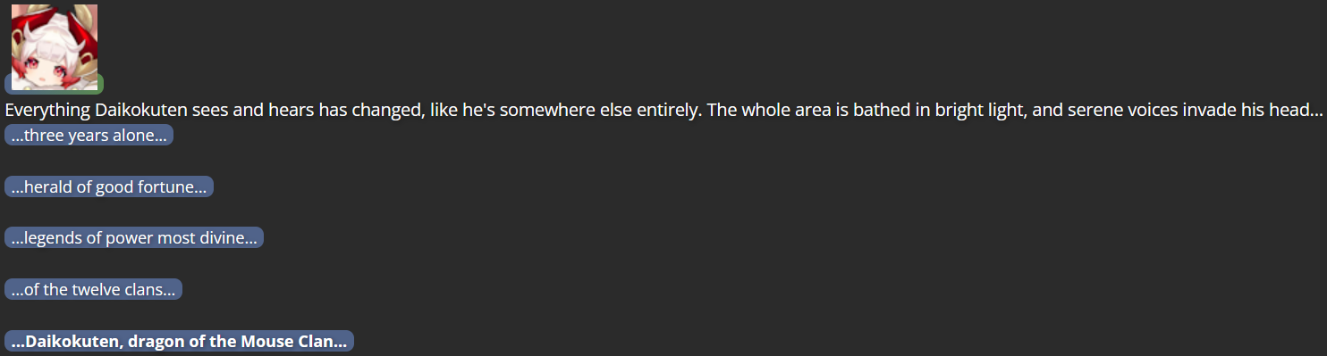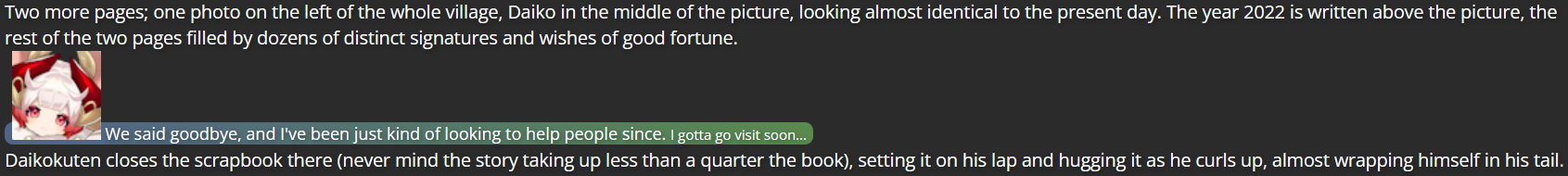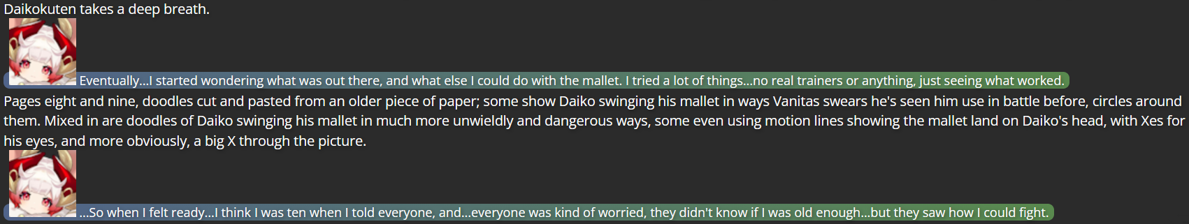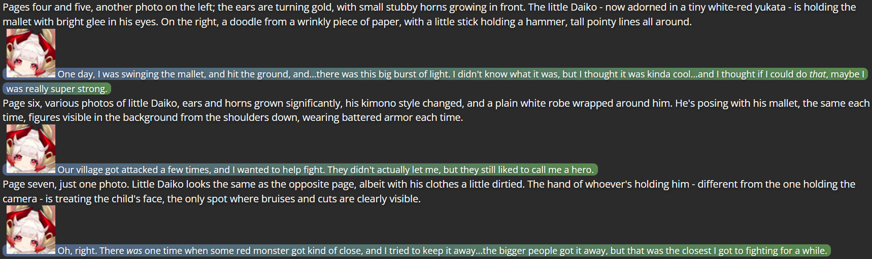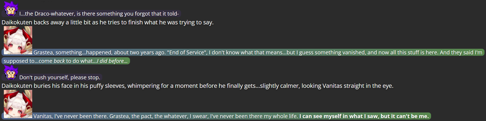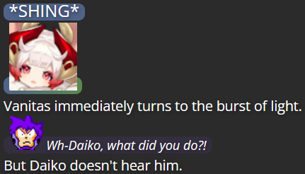 Daikokuten was far from my first character to significantly diverge from the backstory of his source material, but the steps I had taken to try and figure out how to introduce him in Chaos Zone in the first place meant I had paid extra attention to the implications of his presence to those familiar with the original character, and decided to write a story that not only established how different Daiko was from his original Dragalia Lost counterpart, but also who he was in this continuity, all written around the initial idea of how he would react to learning of such a grandiose “past” that he never had.