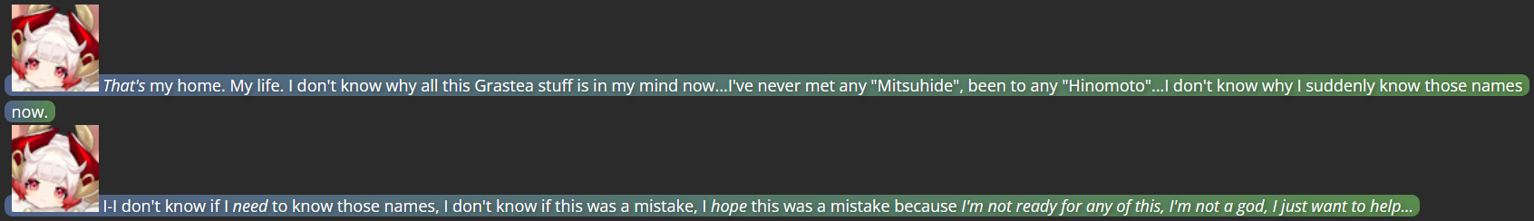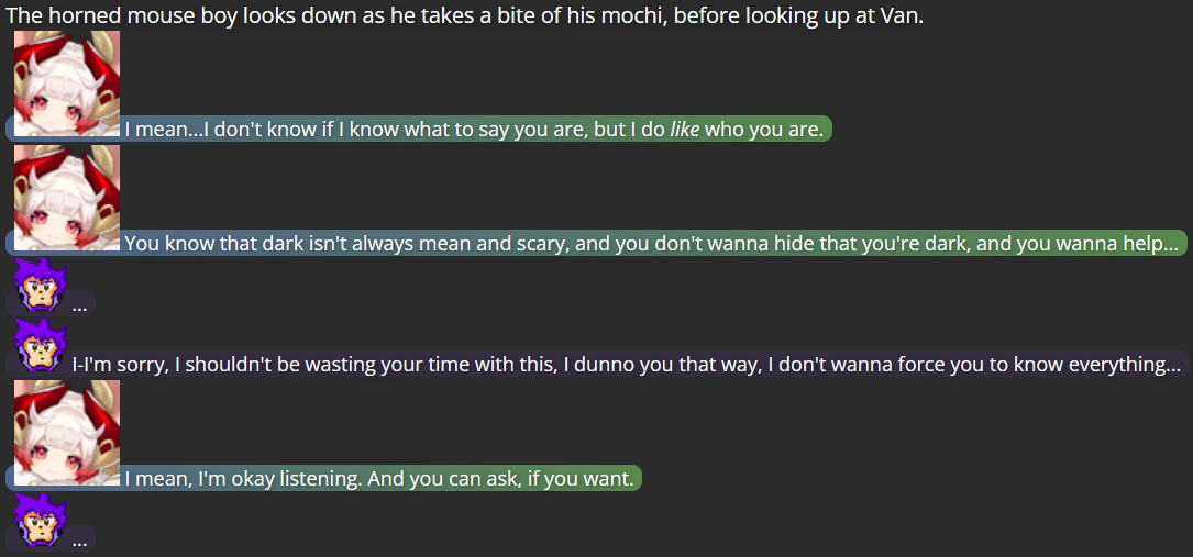 The writing process of this story was quite different from most of my prior Chaos Zone writing: For one, I was still accommodating for the lower activity among other writers since some time in 2024; “A Spirit’s Self-Reflection” was also written in such a context, though while I had been taking week-long pauses between consecutive updates for that story (and continued to do so for the first few segments of this story), I eventually reduced my limitation so updates were at least a day apart, which I think gave me a much better flow writing the story piece by piece.