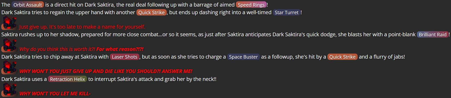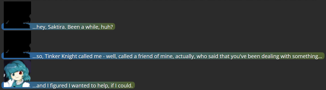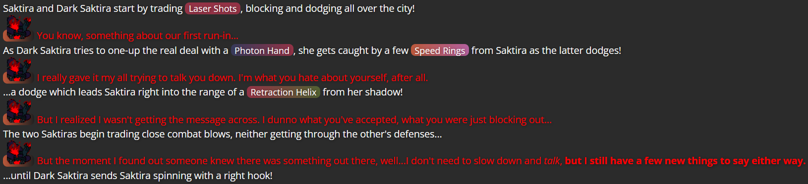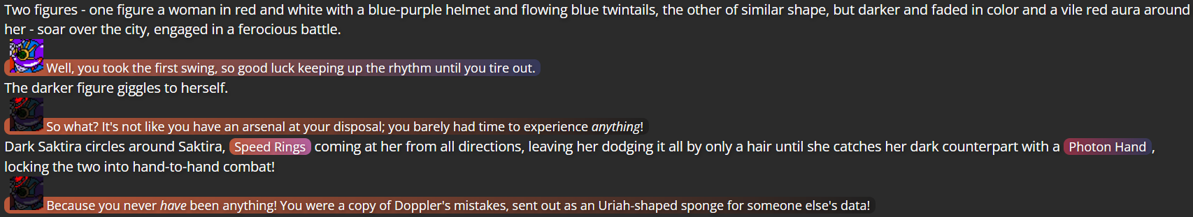 Having the story open in the middle of a fight with Dark Saktira was me deciding that the initial encounter between Saktira CC and her doppelganger would be best (for the Mega Man RPG Prototype website, anyway) if I skipped the initial “reveal” of Dark Saktira, since other users had provided similar reveals for their respective character vs. doppelganger scenarios, and it wasn’t the part of the story I wanted to focus on.