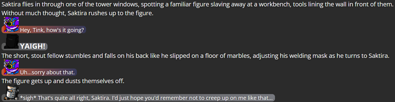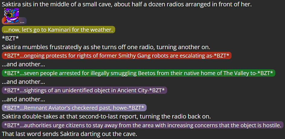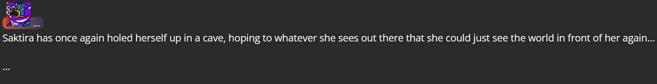 (Flashing between 13 different moments in Chaos Zone before this story began, containing the majority of Saktira’s relevant appearances; the idea is that Saktira can actually see the website itself in this moment, instead of seeing the world the writing describes)