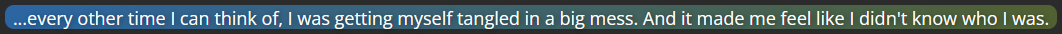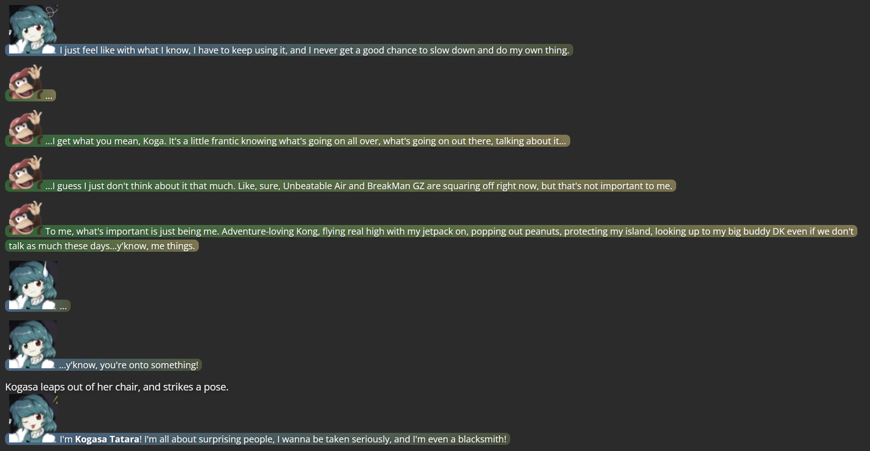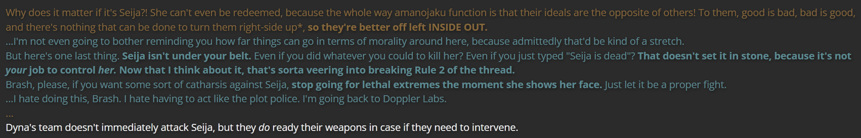 (A flashback to long ago, in an incident where Kogasa stopped me from killing Seija by becoming a narrator; my text when I’m talking to Kogasa is brown, while Kogasa’s text when talking to me is teal)