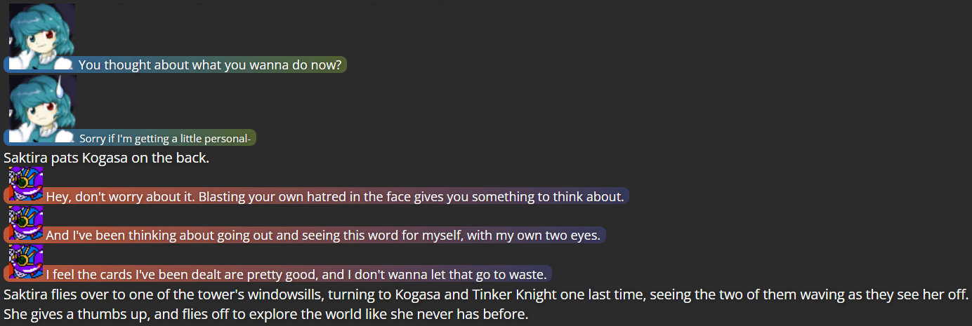 Kogasa was probably the biggest source of fourth wall-themed writing before “Dark Side of the Wall”, and having already given her a conclusion to her own, smaller existential struggles (as seen in flashbacks), I figured she’d be the best person to help Saktira with what she was going through.