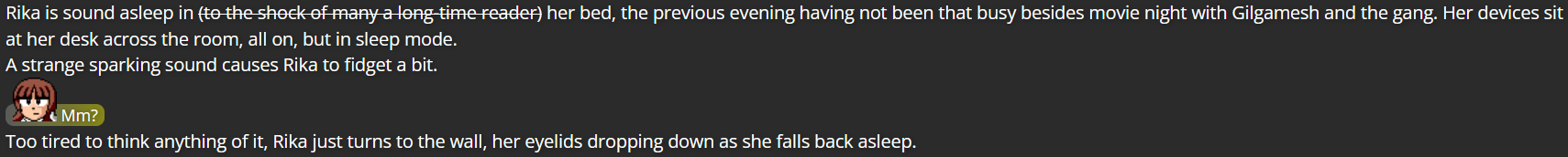 (The scene cuts to midnight, in Rika’s underground base)