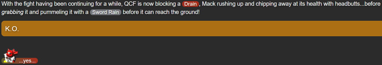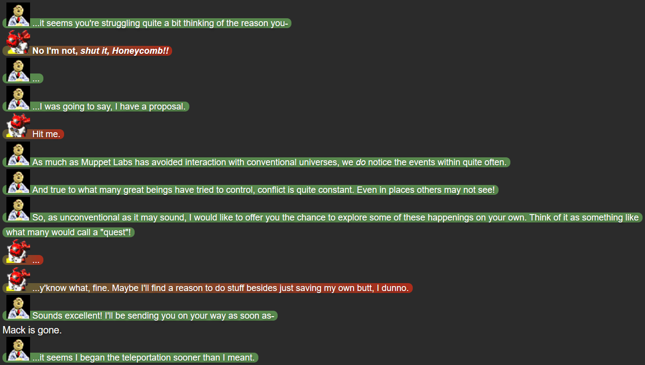 While I started this plotline with the intent of ending it once Mack had learned to fight, I felt dissatisfied when I actually got there, realizing that I hadn’t actually developed Mack’s personality; just because he was strong didn’t meant he was more than a troublemaker now. This is how I got the idea to give him a longer plotline, where he could explore the world and develop from proper interactions with characters. It’s also why I refer to this section of the story as “Part 0”; it’s technically relevant to the greater story, but was originally planned as a smaller story, with the greater scope of Parts 1-4 not being invented when this part started out.