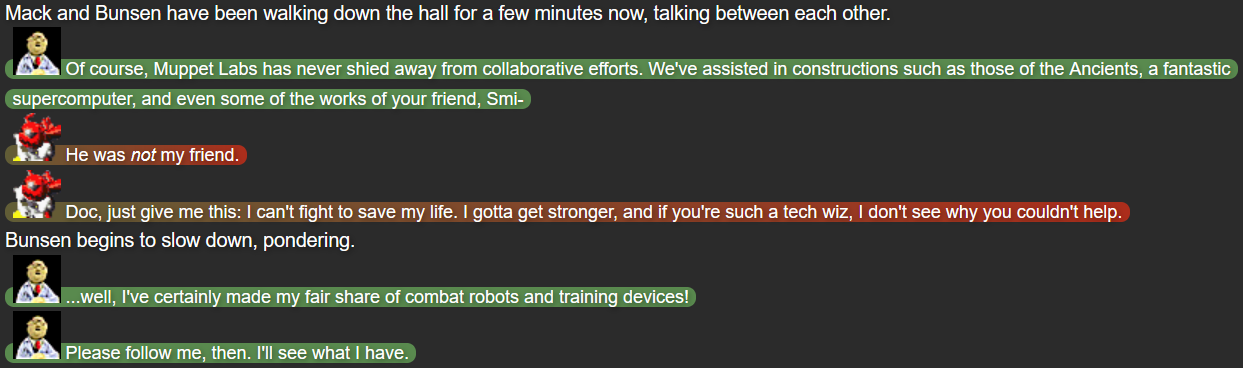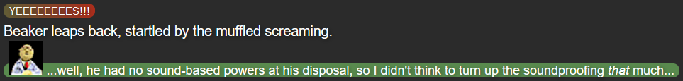 Dr. Bunsen Honeydew and Beaker (from the Muppet franchise) being figures of mysterious power was me trying to play off a trend of many other writers of Chaos Zone, where similarly comedic characters (such as Shaggy from Scooby-Doo, or real-life actor Will Smith) would be all-powerful deities, sometimes acting wildly different from official media; Kermit the Frog (the star of The Muppets) had already been used in such a role, and Fozzie Bear (a fellow Muppet) had been alluded to in a similar fashion. As a genuine Muppet fan, I chose to give Bunsen and Beaker a vague high position of power while also trying to stay true to their characters in official Muppet media.