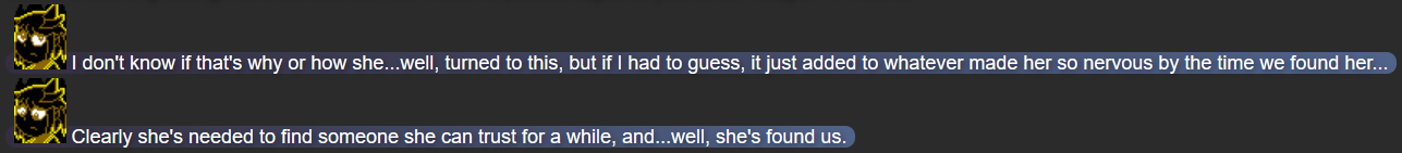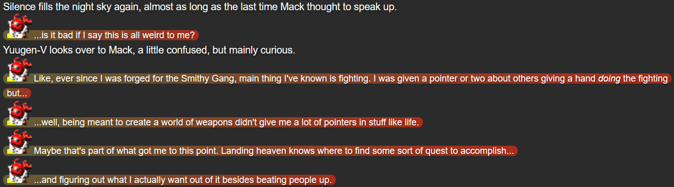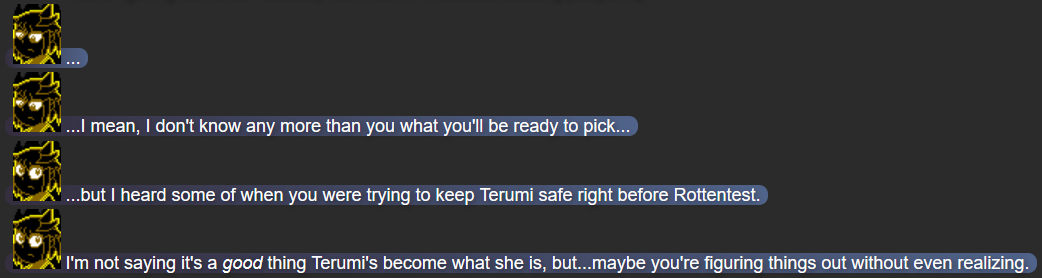 The implicit reveal that Terumi lost her home was admittedly an idea I had thinking about Terumi in my writing going forward; there were a couple details of Terumi’s unseen backstory that concerned me (how her parents would react to her ghostly state, and how her home connected to the rest of the Chaos Zone world), and while having her lose her home before being possessed by Mitsumo did feel somewhat awkward given how much she’d already been through with Mitsumo alone, I felt it would help keep her dynamic with Mack and Yuugen-V intact, since they now had a feeling of responsibility as the first people Terumi could find to help her in years.