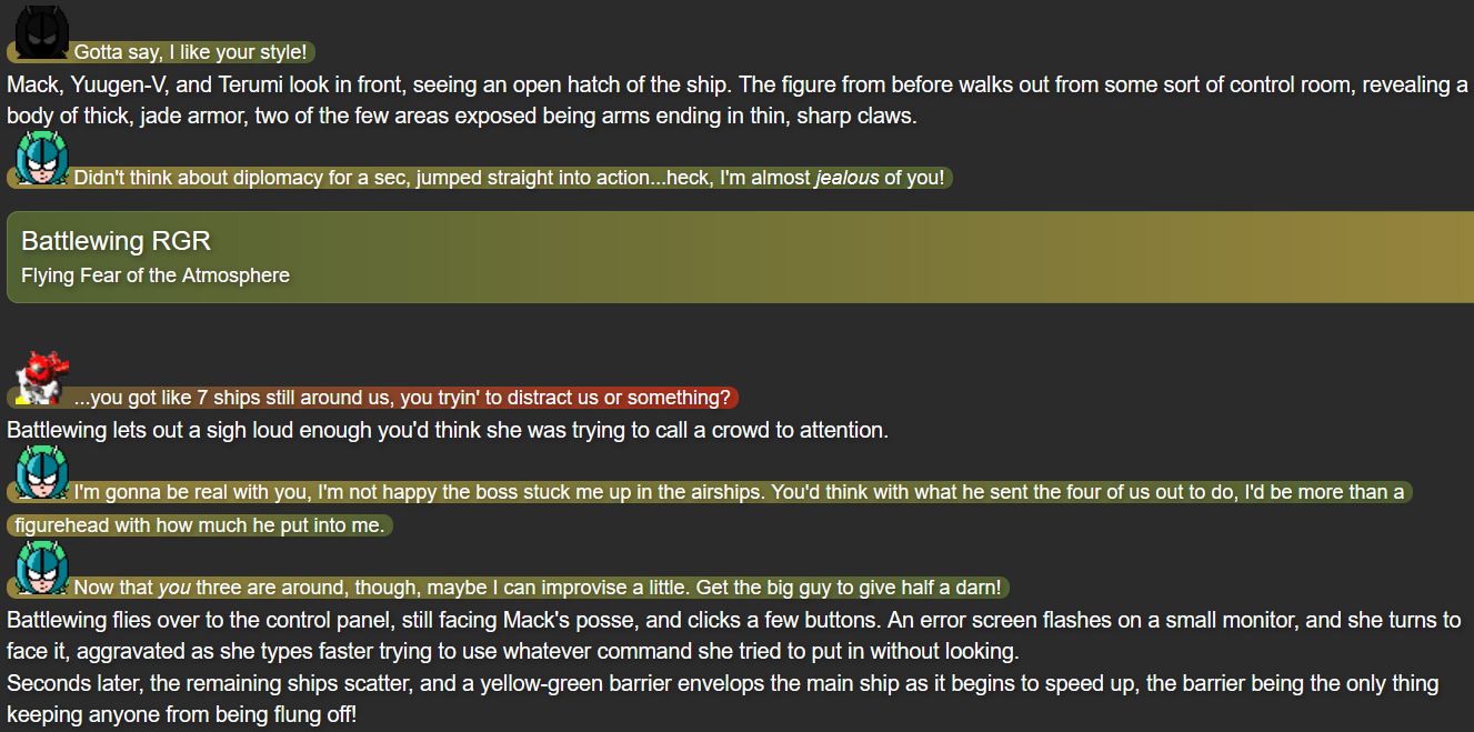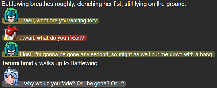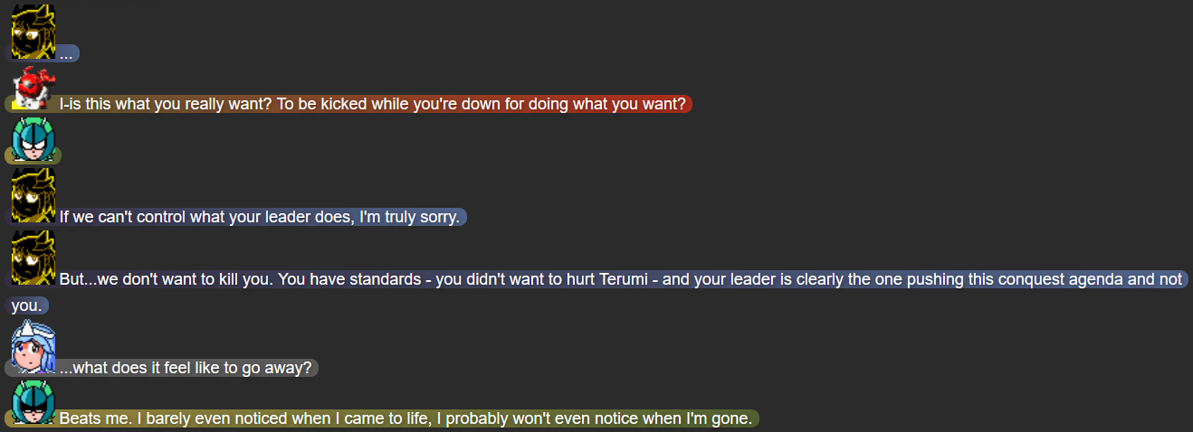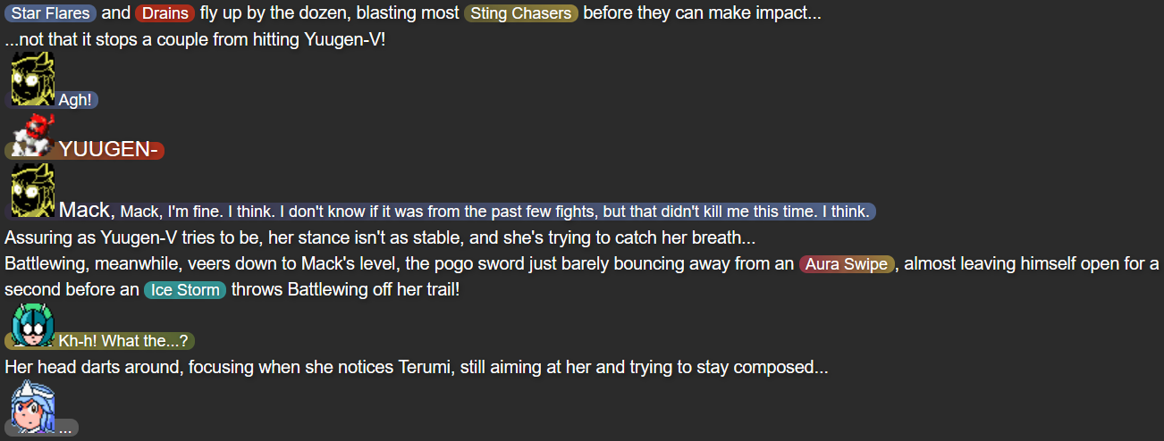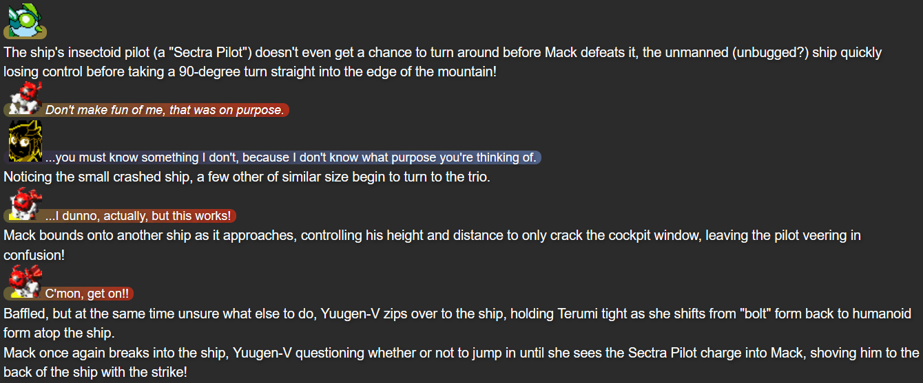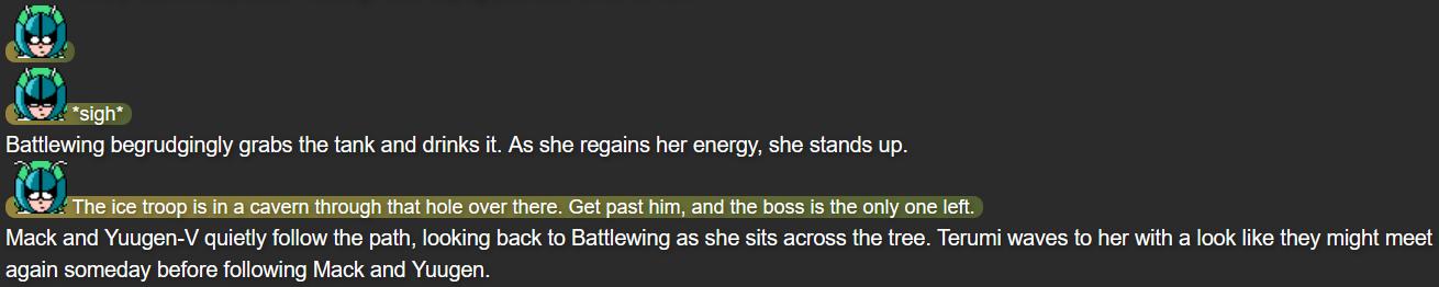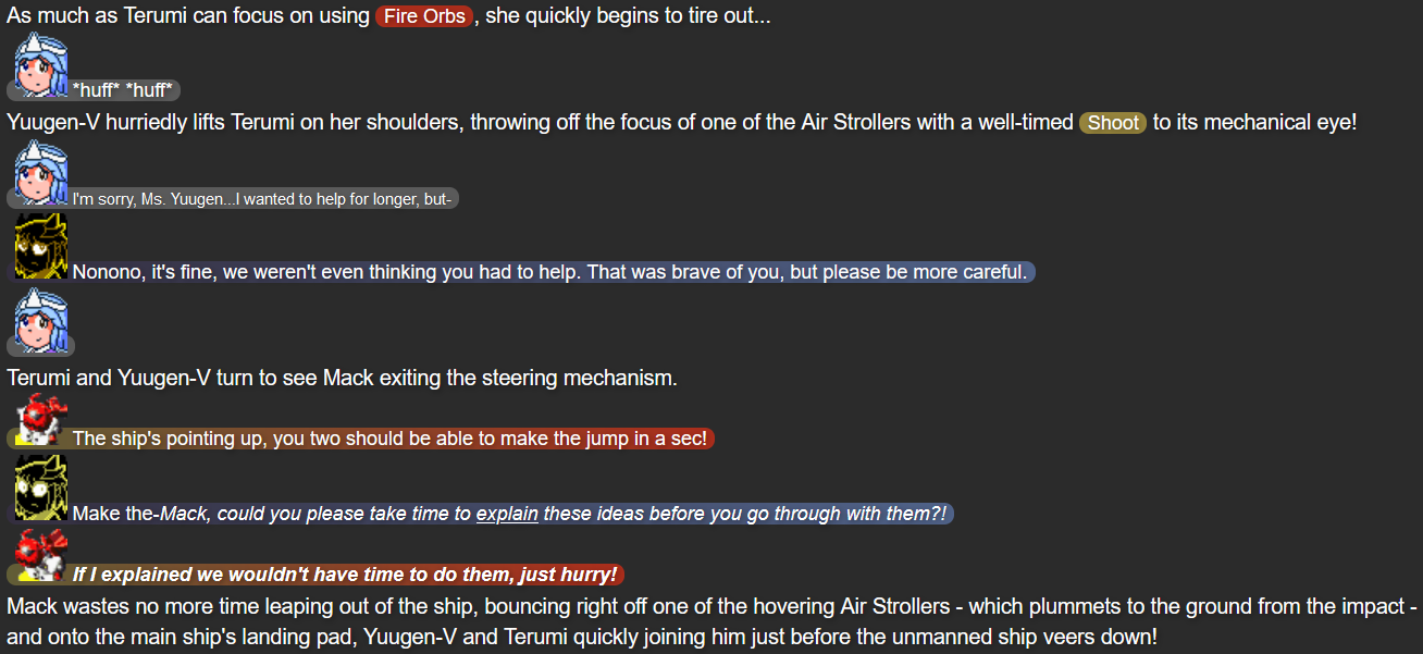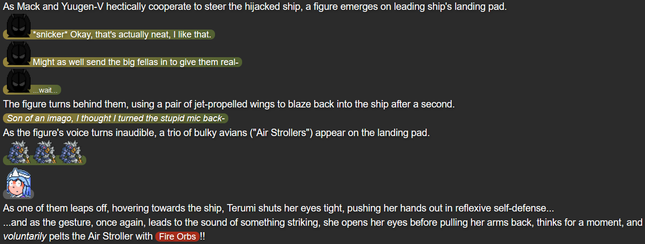 This was also the point in the story that I feel I struck the right balance of what I wanted out of Terumi; while Mack and Yuugen-V don’t expect her to be fully self-reliant after whatever happened in her past, she’s taking action when she herself feels she needs to, while not running headfirst into trouble in a way that could make her feel like more trouble than she’s worth.