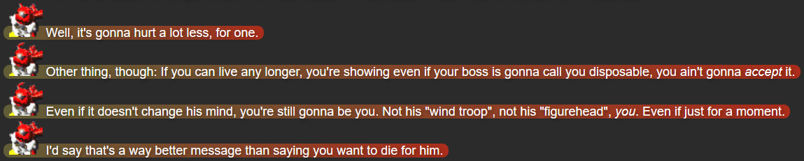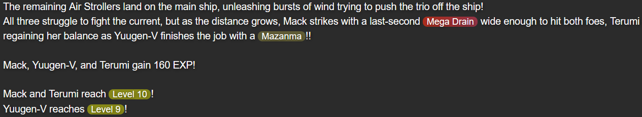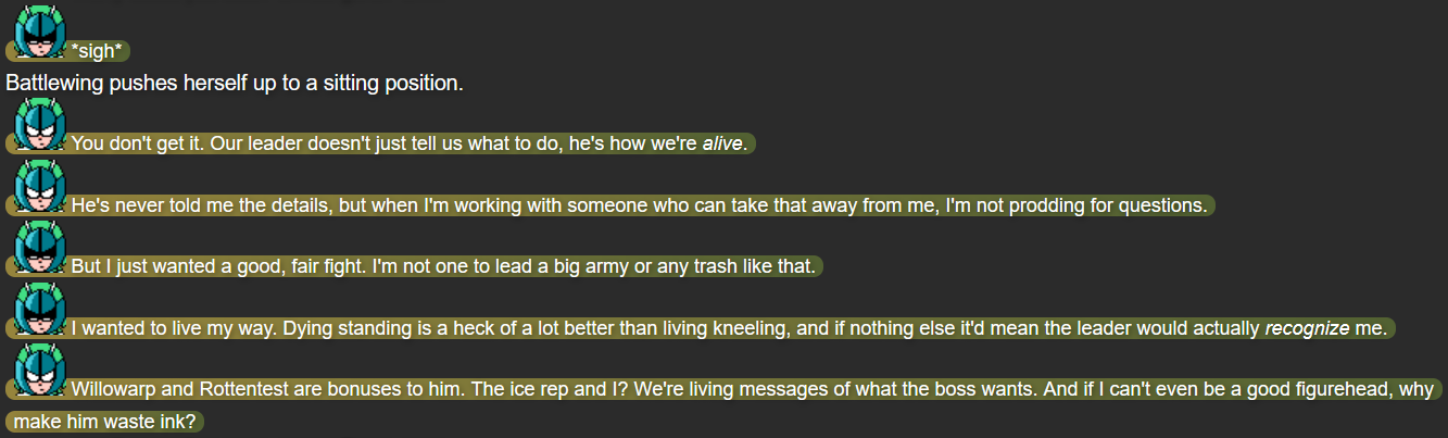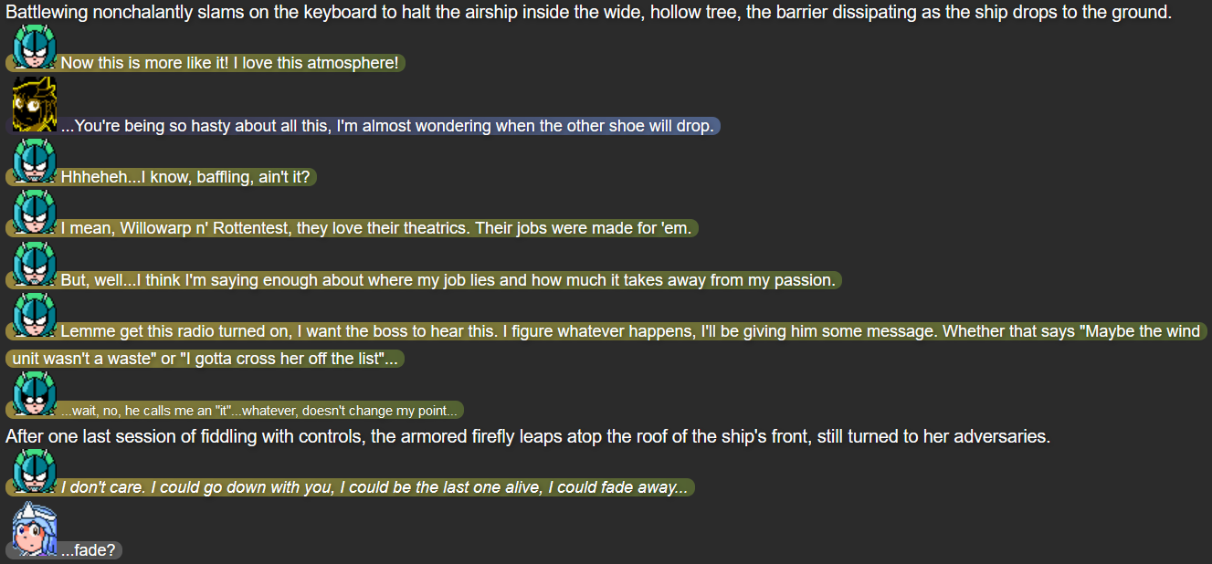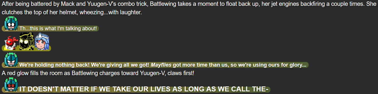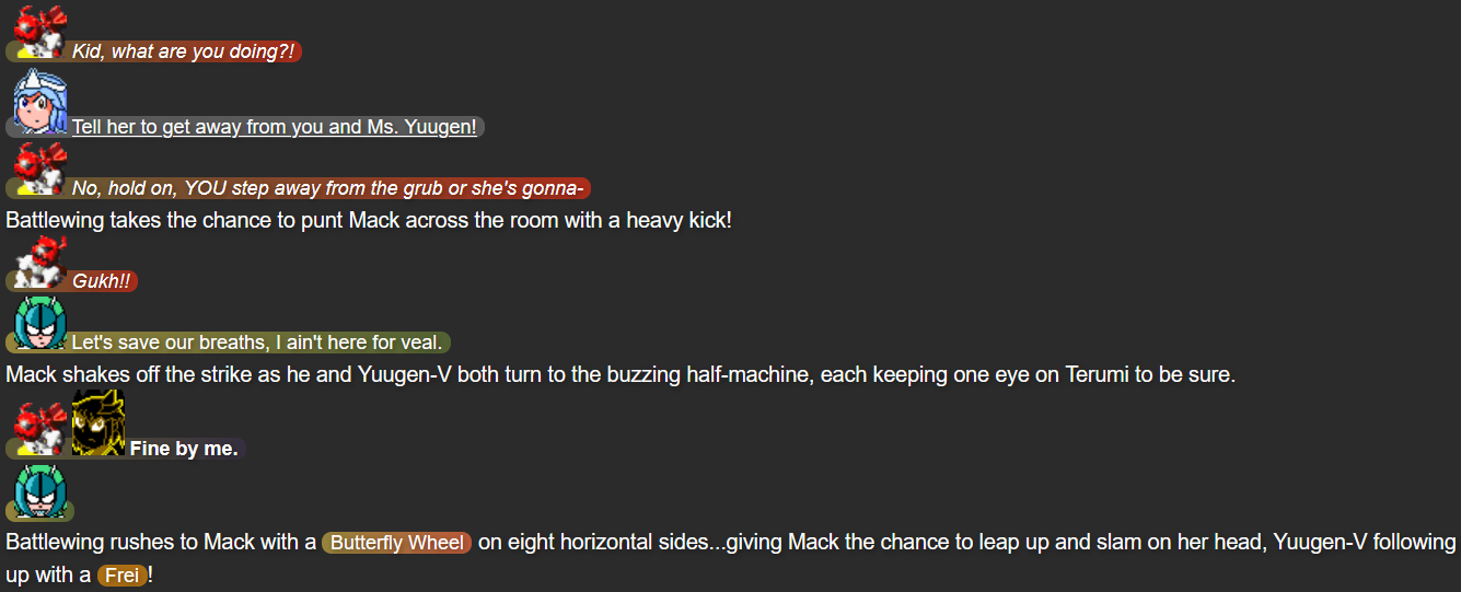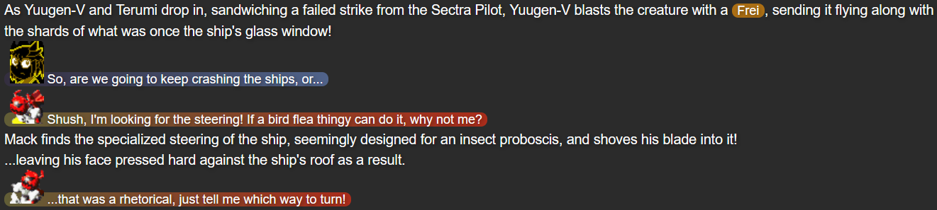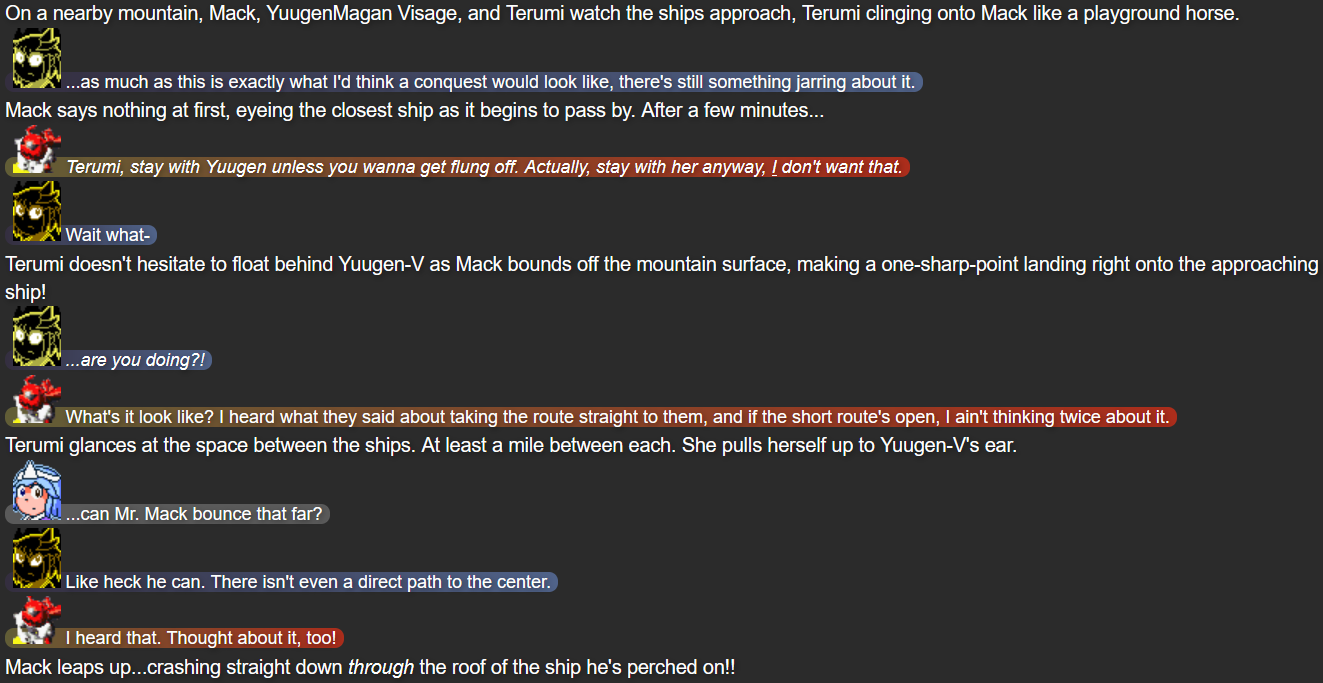 This was also the point in the story that I feel I struck the right balance of what I wanted out of Terumi; while Mack and Yuugen-V don’t expect her to be fully self-reliant after whatever happened in her past, she’s taking action when she herself feels she needs to, while not running headfirst into trouble in a way that could make her feel like more trouble than she’s worth.