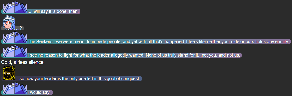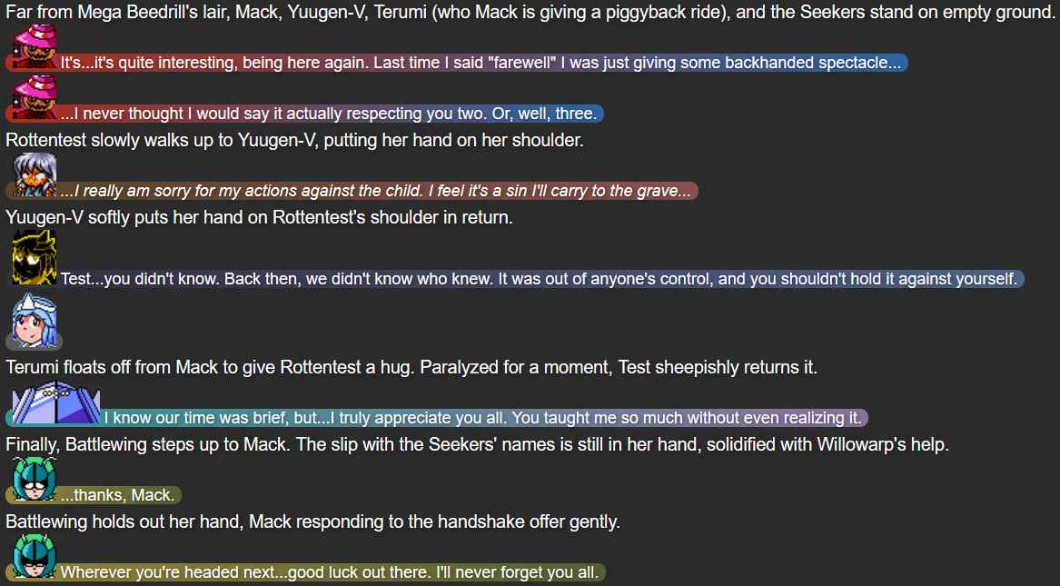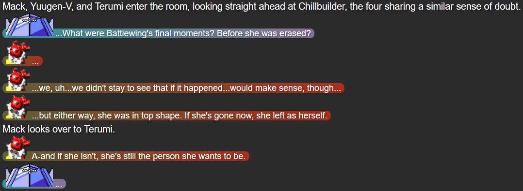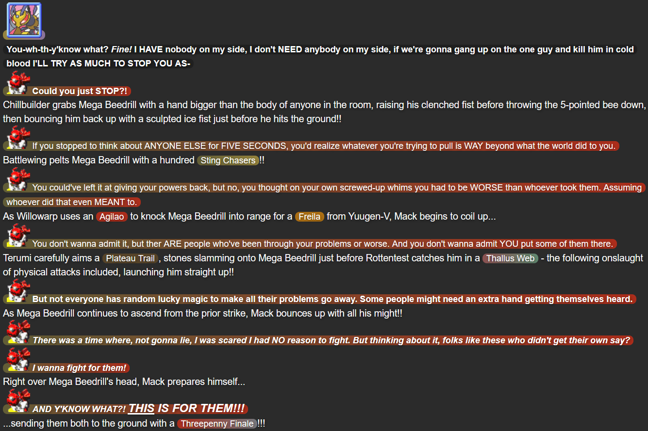 With this part, I felt that with the growing emphasis on the who the Seekers of Strength were in the previous two parts (and the interlude of “Part 2.5”), it’d cement just how much I wanted to humanize them by having most of the journey to face the last Seeker, Chillbuilder, be portrayed from the perspective of Chillbuilder instead of the main “heroes”. It also gave me more time to flesh out how Willowarp and Rottentest felt about their troubles, and show an interesting emotional angle by having it clear that nobody knew Battlewing wasn’t erased by Mega Beedrill until the eleventh hour.