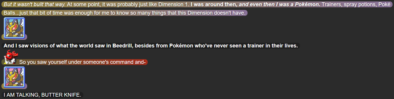 (Present day, written by me; the sections in beige/lavender are Mega Beedrill’s dialogue when cutting to flashbacks)