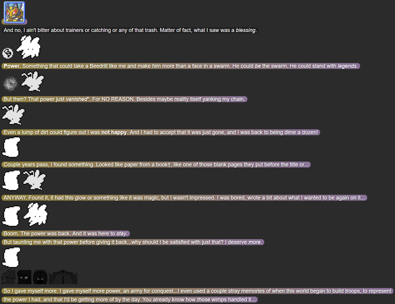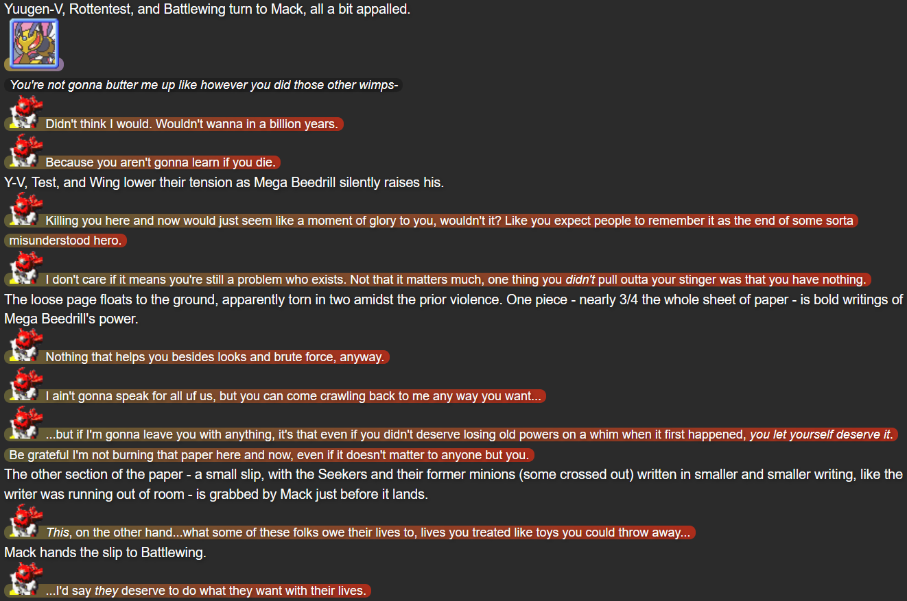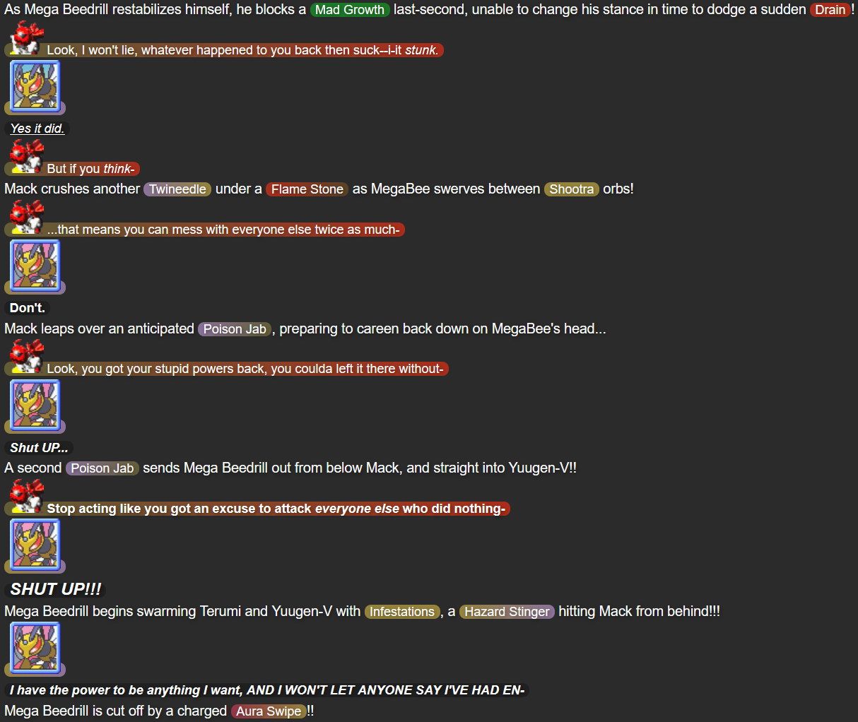 - Mega Beedrill: A character based on the Pokémon species “Beedrill”, namely an empowered form they can take in the 2014 video games Pokémon Omega Ruby and Pokémon Alpha Sapphire. The leader of the Seekers of Strength, Mega Beedrill has yet to be mentioned by name in the story. “Part 2.5” and “Part 3” reveal that he’s abusive to the Seekers, neglecting their concerns and even misgendering and (non-sexually) objectifying Battlewing. He also seems to have control over their existence, with Battlewing expecting herself to have been erased from existence by Mega Beedrill in “Part 3”. Before his identity is revealed in this part, his dialogue is instead signaled by a big black box with dark gray borders.