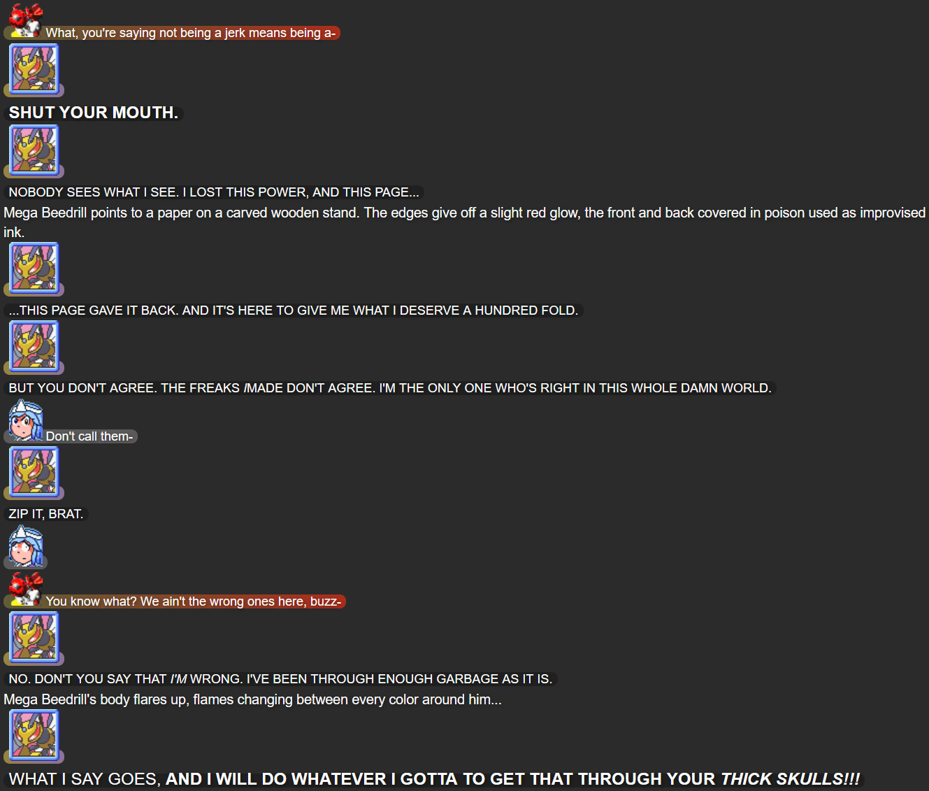 - “The Page”: A previous Chaos Zone storyline (written by the user “ch4s3man”) involved the antagonist creating new characters from a book containing all the characters who existed in the world of Chaos Zone. While the book is mostly out of the hands of anyone else, the “page”/”paper” Mega Beedrill discusses late in this story comes from the book.