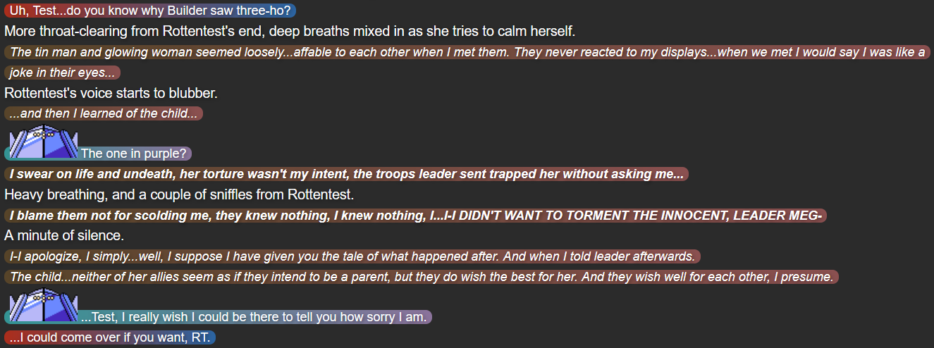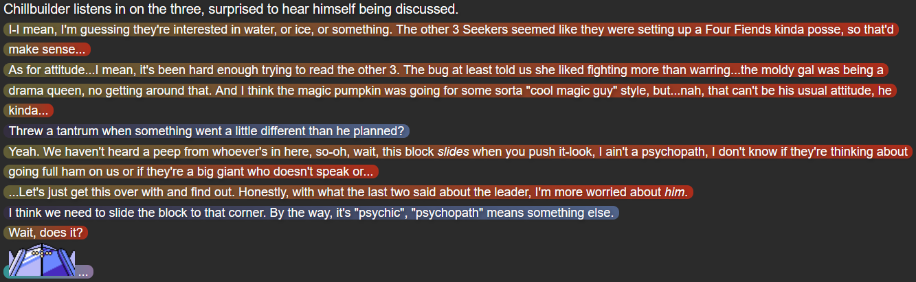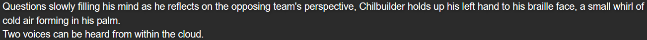 (Cut back to Chillbuilder’s room – the “Boss Room”; dialogue from characters not in the room is indicated by the colors their dialogue is usually marked with – faded-brown/red for Mack, dark/light grayish blue for Yuugen-V, and gray for Terumi)