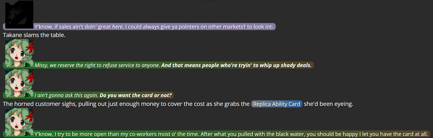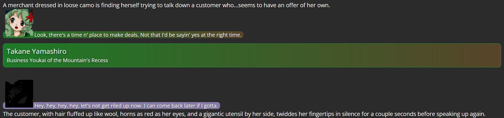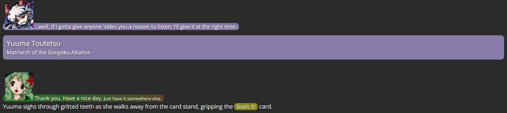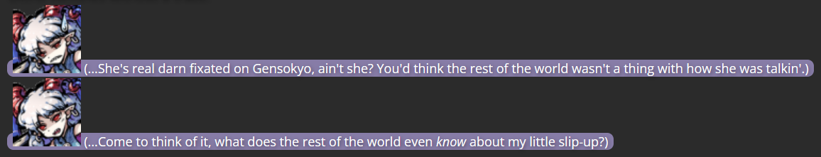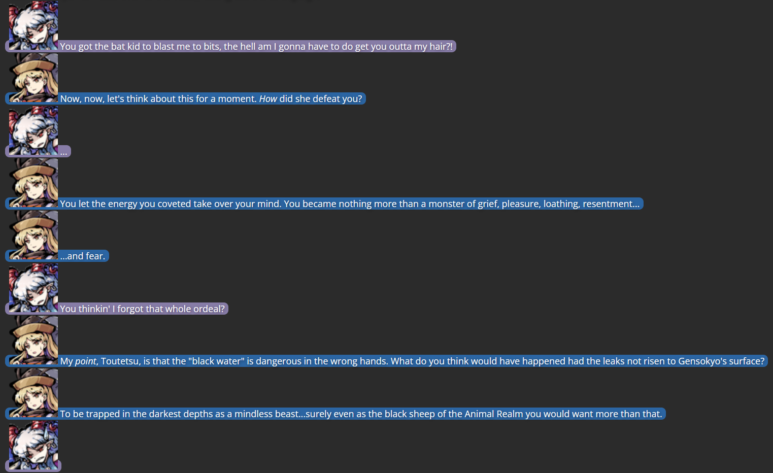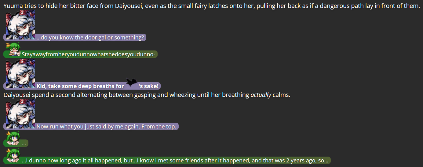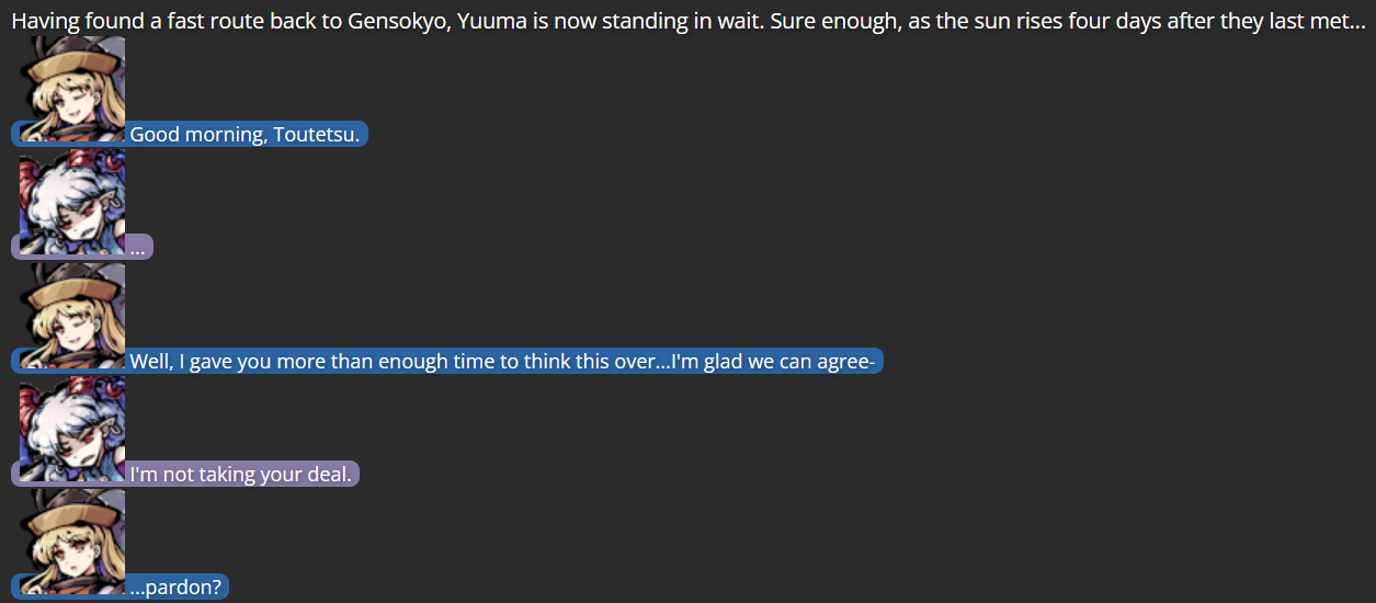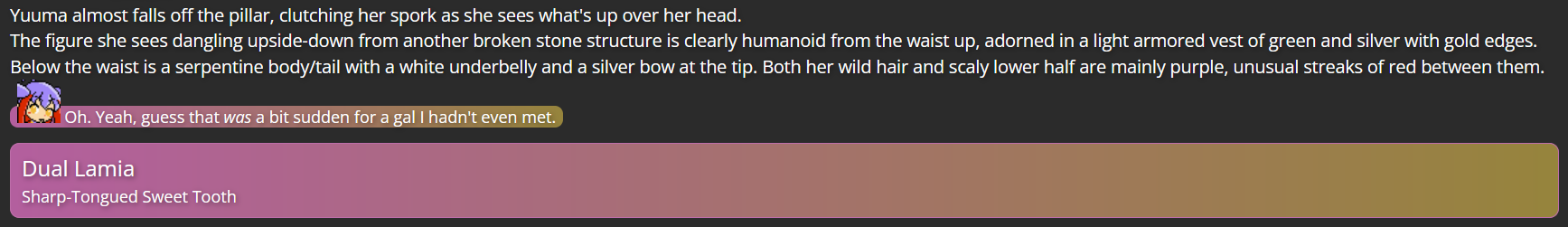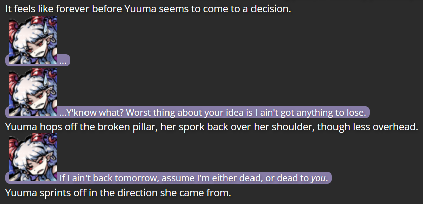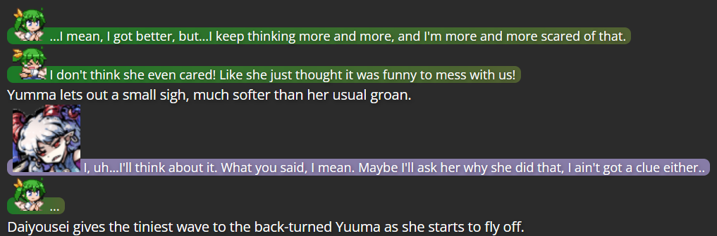 This is where Dual Lamia came in; as a character not tied to the Touhou series, she had no bias against Yuuma, and her own experiences with self-discovery came in handy giving a final outsider’s perspective to Yuuma, which was the final push she needed to decide to turn over a new leaf (helped by the fact that living far from Gensokyo would keep her from bothering those she had poor history with).