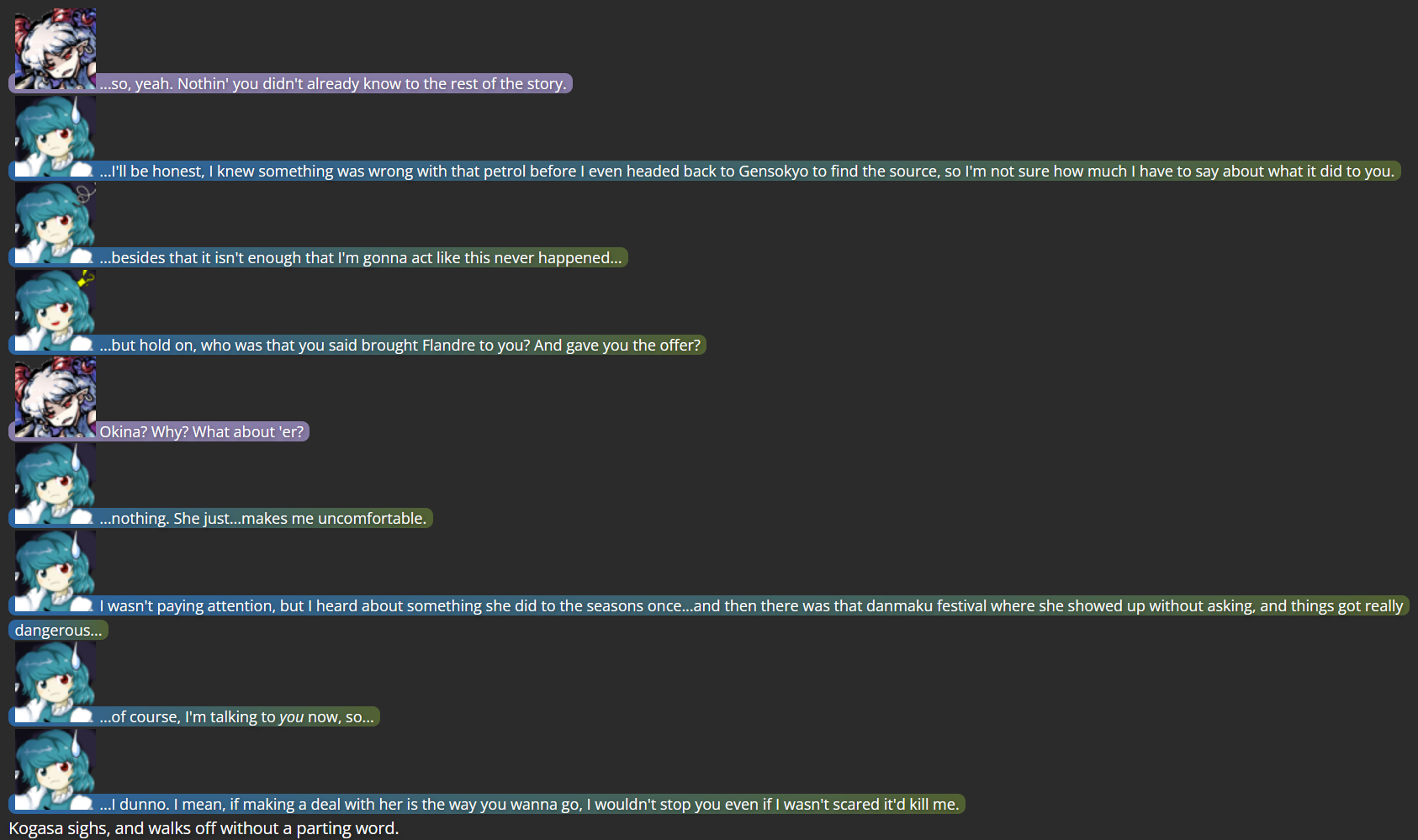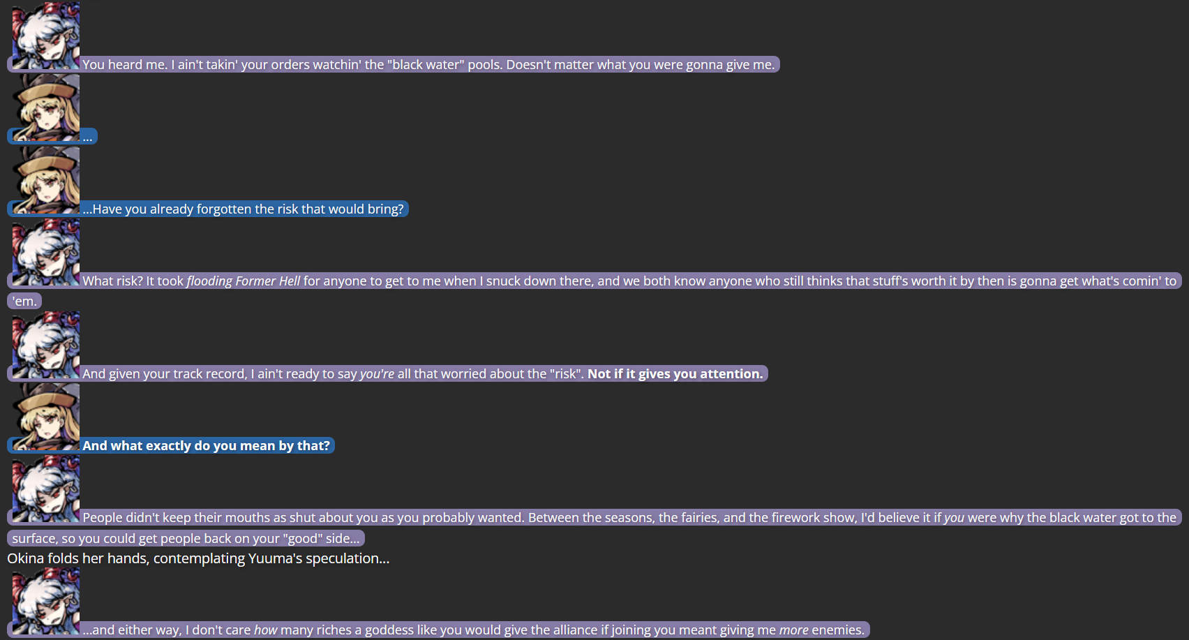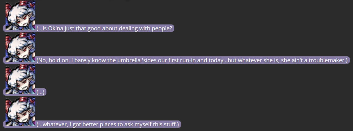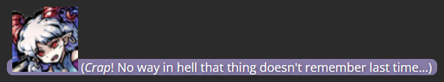 I’d like to end with a little bit of trivia: Because I had no intentions of using Okina outside of this storyline, all of my writing on the Mega Man RPG Prototype website referred to her as simply “Hidden Figure/Hidden Deity”, with her face always in shadow; this was meant to signal that if someone wanted to use Okina afterwards, they could do so. To make the story easier to follow on this website, I changed the writing in the screenshots above to refer to Okina as if she were any other character, and gave her proper mugshots like everyone else.