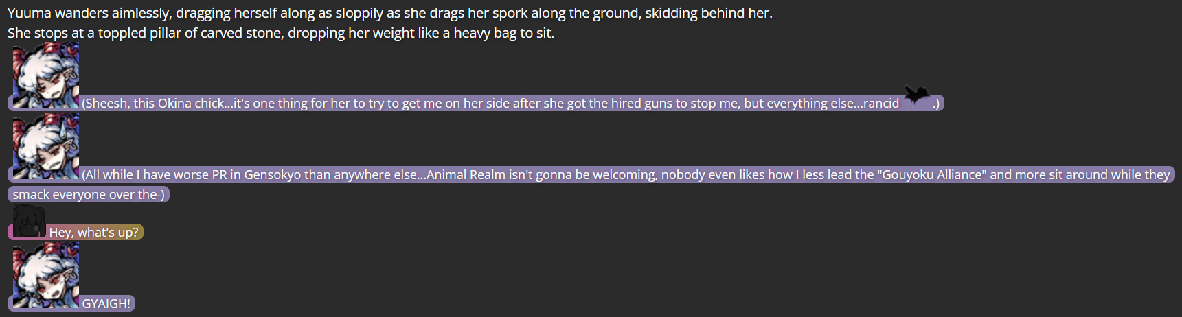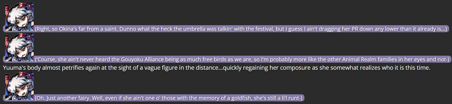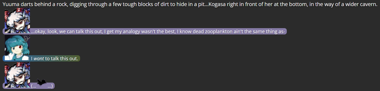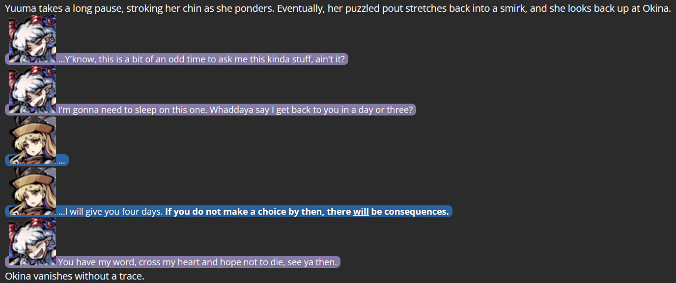 With some personal beliefs I had about redemption and forgiveness in the front of my mind at the time, my thoughts on how to handle Yuuma changed drastically; with the Touhou series seemingly set on keeping Yuuma a villain (something that rarely happens in the series), and thoughts on how her position may be reduced to a simple “status quo” she wouldn’t develop further from, I decided to write an alternate version of Yuuma’s story, having her talk Okina into giving her a chance to look at the world outside Gensokyo (which wasn’t an option in the series proper; only in Chaos Zone can one travel to and from Gensokyo so easily).