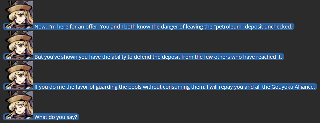 - The main antagonist of the story is Yuuma Toutetsu, the head of the “Gouyoku Alliance” (one of four gangs from the Animal Realm, a world where the belief that “might makes right” reigns supreme), who had found her way deep into the “Sea of Petroleum”, seemingly an endless reserve of petrol deep within the Hell of the Touhou series. It’s revealed early in the story that the Sea of Petroleum is, in truth, the “Abandoned Hell of Blood Pools”, a sea of blood from condemned souls. This does not bother Yuuma at all, with her comparing it to how fossil fuels came from living organisms.